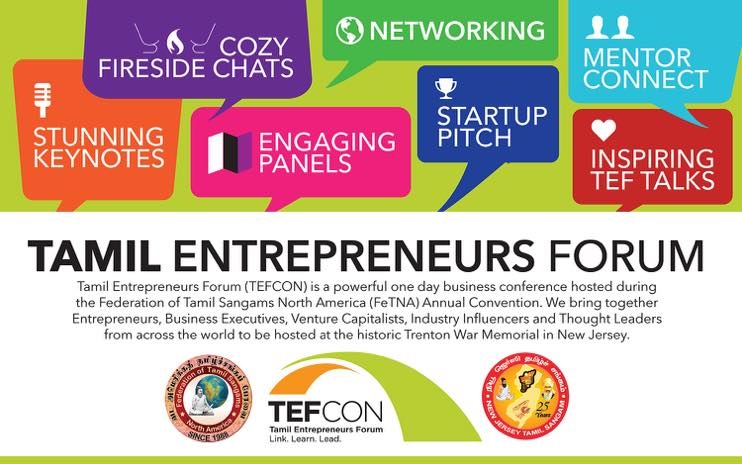 Tamil Entrepreneurs Forum (TEF2016) is a powerful one day business conference hosted during the Federation of Tamil Sangams North America (FeTNA) Annual Convention. We bring together Entrepreneurs, Business Executives, Venture Capitalists, Industry Influencers and Thought Leaders from across the world to be hosted at the historic Trenton War Memorial in New Jersey.