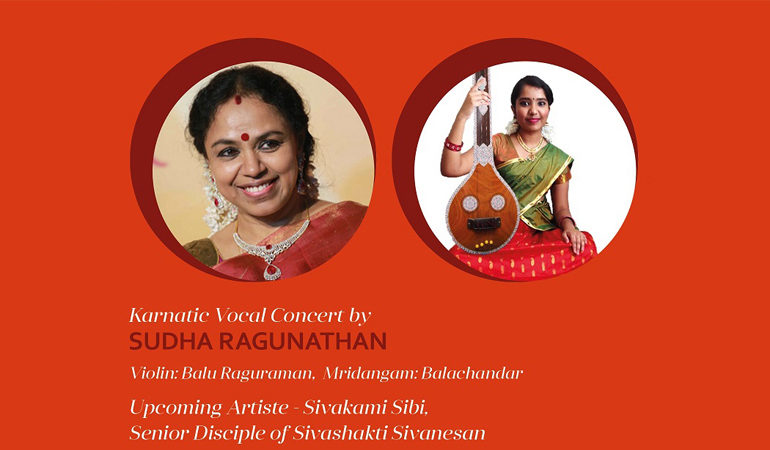 She will be accompanied by Balu Raguraman on violin, Balachandar on Mridangam and preceded on vocals by upcoming artiste Sivakami Sibi, senior disciple of Smt Sivashakti Sivanesan.