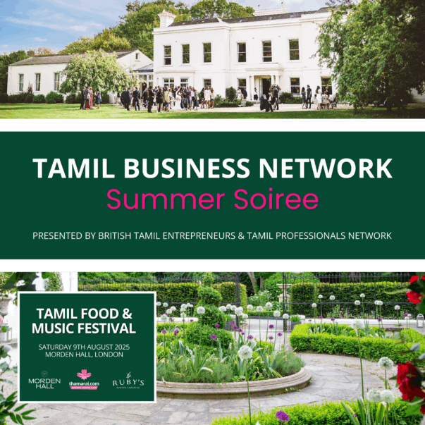 This event is proudly brought to you by British Tamil Entrepreneurs, Tamil Professionals Network, Tamil Institute for Leadership Excellence & British Tamil Chamber of Commerce, in collaboration with Thamarai, Ruby’s, and Morden Hall.