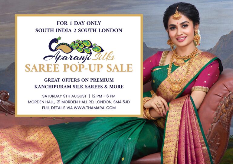 South India based fashion house Aparanji Silks, specialising in hand-crafted luxury silk sarees, are hosting a Pop-up Saree Sale at Morden Hall, a stunning Manor House in South London.