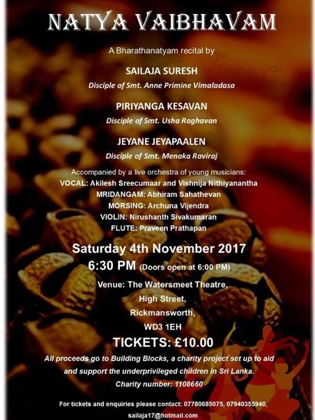 A group of young artists are putting on a Bharatanatyam show to raise money for Building Blocks – a charity project set up to aid and support underprivileged children in Sri Lanka.